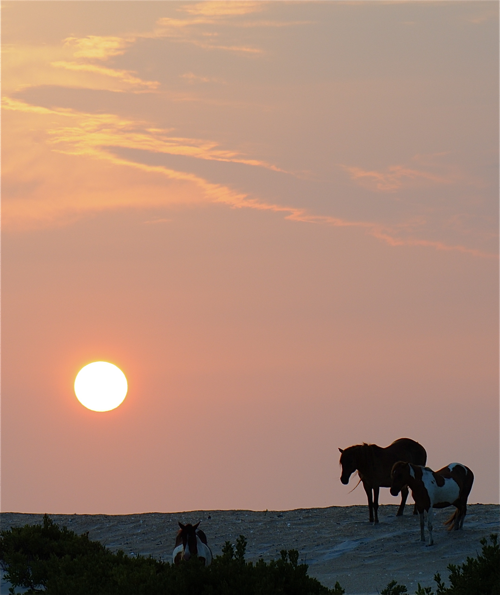 Brad, to my right, had made his way through the tufts of marsh grass and beyond the camps to get a better view of the ridge line. There, silhouetted against the big orange sun, were six or seven ponies at various levels. Our patience had paid off.