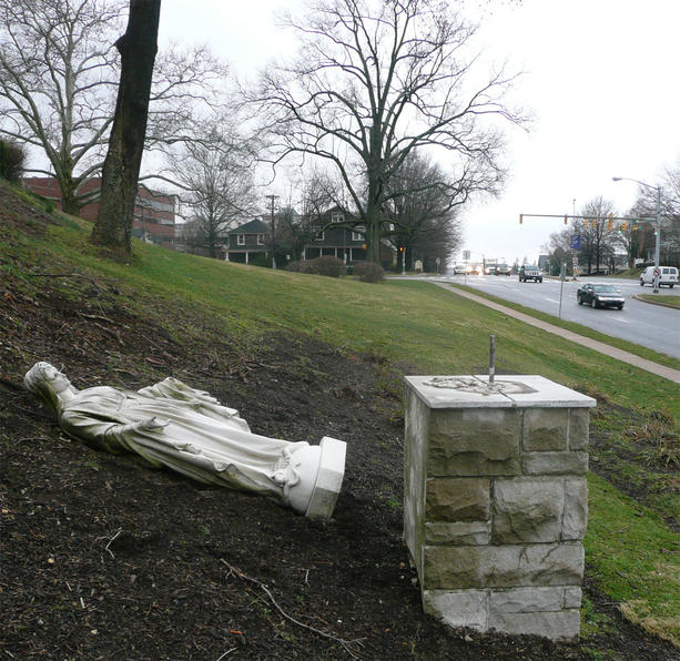 Between 24 and 40 hours after I drove by the Virgin Mary on Friday night, somebody pushed over the statue and, presumably, stole her left hand.