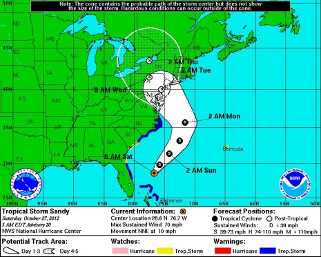 We have just received notification that Hurricane Sandy has been downgraded from a Category 1 Hurricane to a Tropical Storm. In addition, we have received our first weather alert from NWS at 0500 for an areal flood watch in effect from late Saturday Night through Tuesday morning. Additional alerts have just been issued at 0600 for a coastal flood watch and a high wind watch through late Monday.