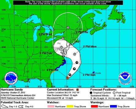 This storm is colossal in size, with tropical storm-force winds extending for 450 miles in each direction from the center. The hurricane will be combining with a nor’easter storm and getting even larger in diameter. This means that the storm is NOT likely to miss Howard County. Please do not fail to make preparations because you believe the storm is going to miss. Substantial power outages are almost certain, and may last a few days to a week.