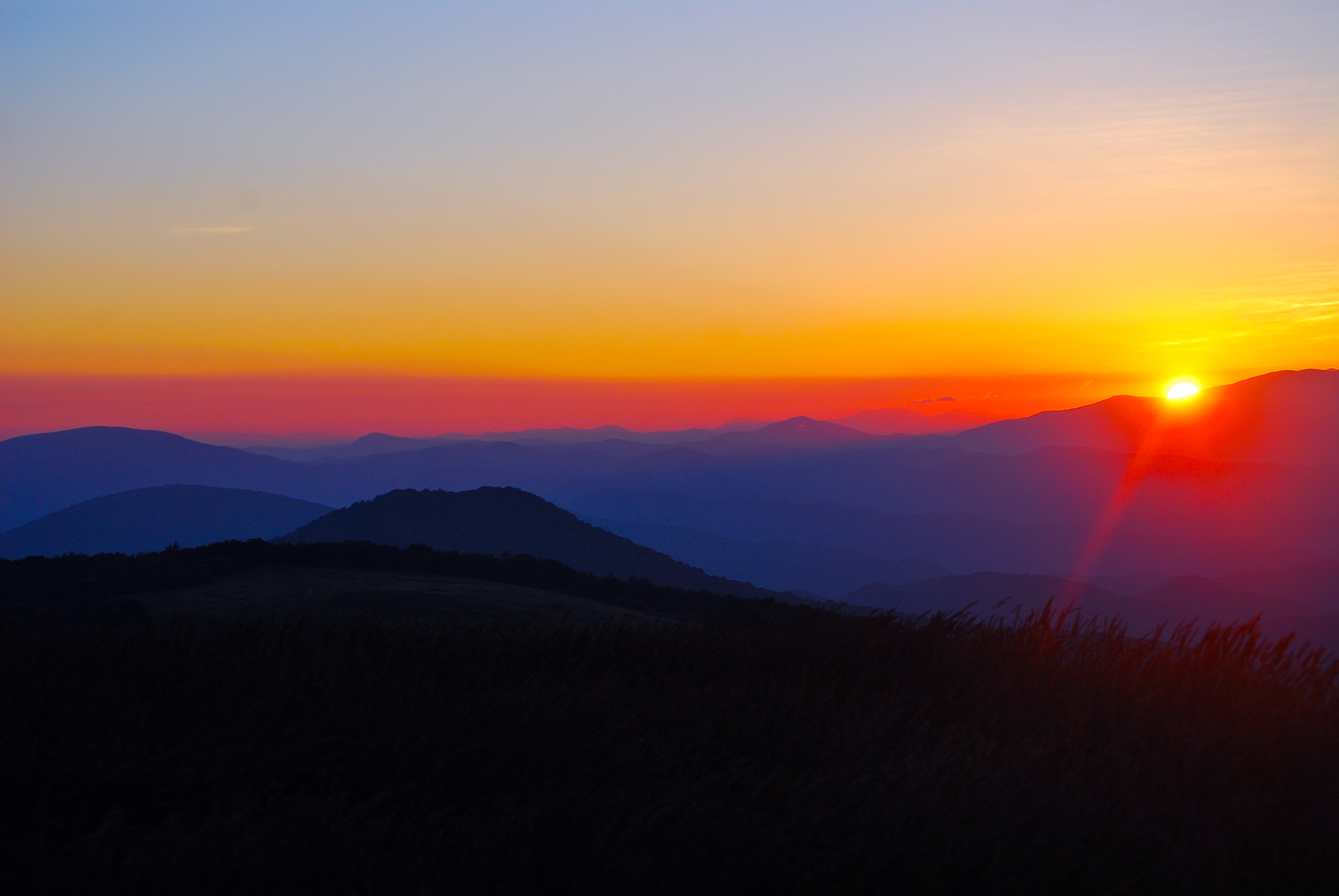 I turn around, and my breath is taken from me. A strong gust of cold wind blows by and I am bathed in deep reds, purples, and blues as the invisible, rising sun sends its precursory hues that define the deep ridges of the Great Smoky Mountains.