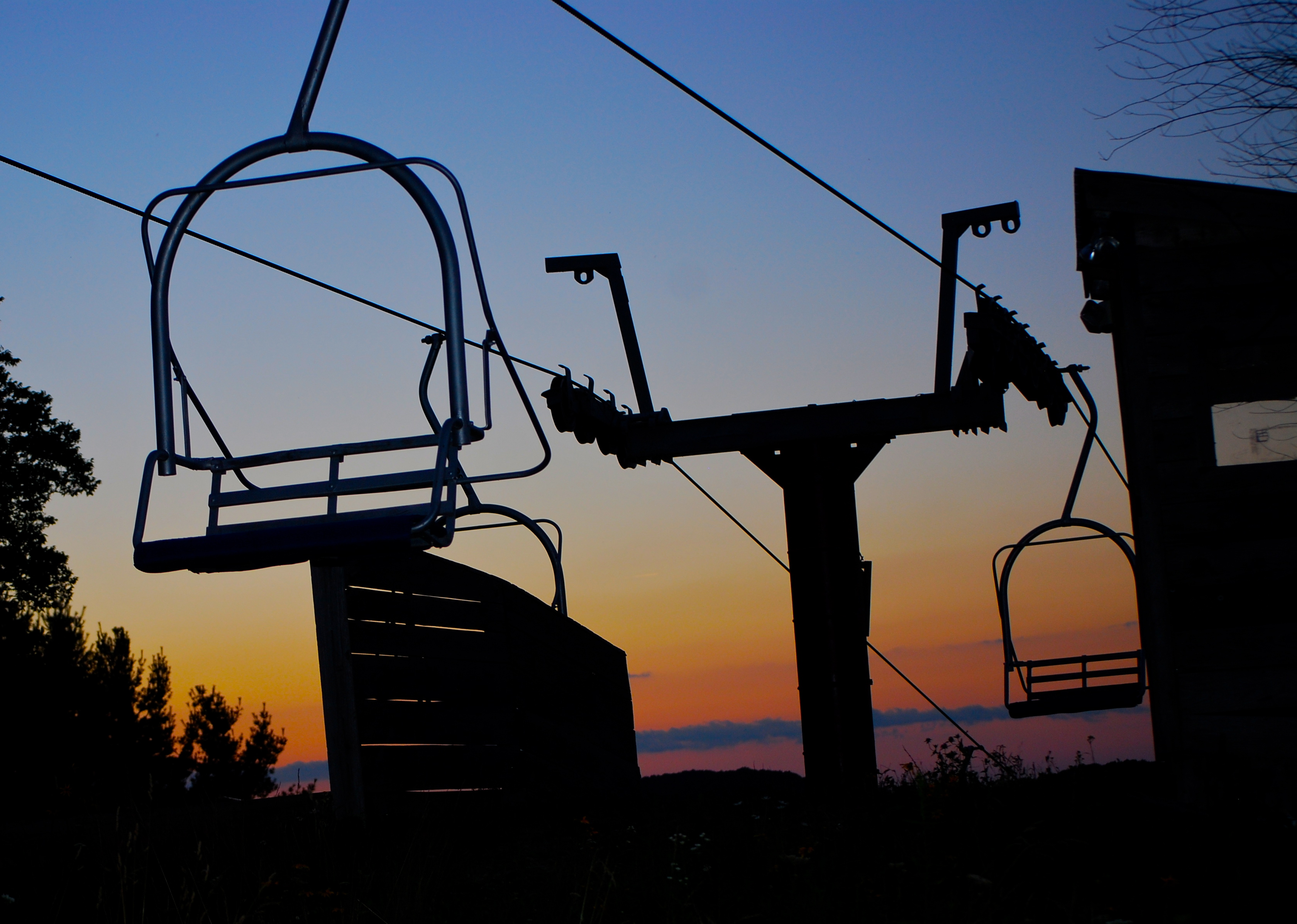 We resume our climb, and when we reach the top, Braeden and Madelyn are walking around the mechanisms of the old ski lift.