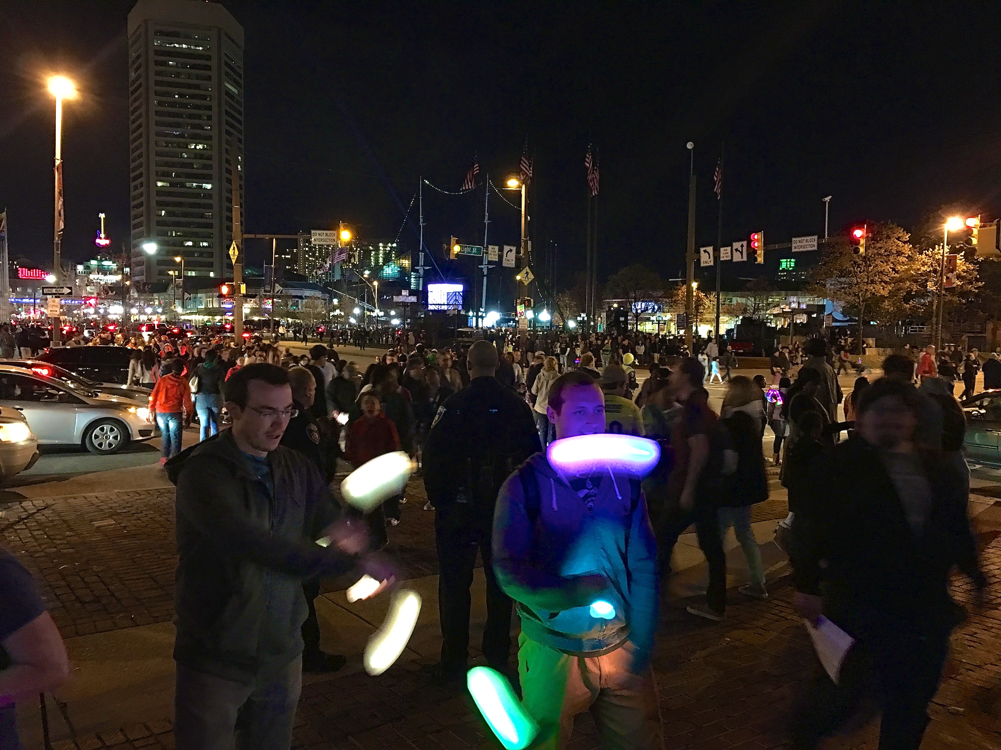 IMG_5341My wife and I are not frequent visitors to downtown Baltimore, and to be honest, I was very hesitant to put ourselves and our two younger children in a public venue with thousands of people crowded around us. Yet, every aspect of this event sparkled and dazzled us. Police officers were laughing with visitors, taking selfies with them and posing for impromptu pictures. We didn’t witness a single incident the entire evening (and we covered a lot of ground). Even when we were caught in a bottleneck of thousands of individuals barely able to move along the front of Baltimore’s World Trade Center, nobody panicked, and we worked through the gridlock together.