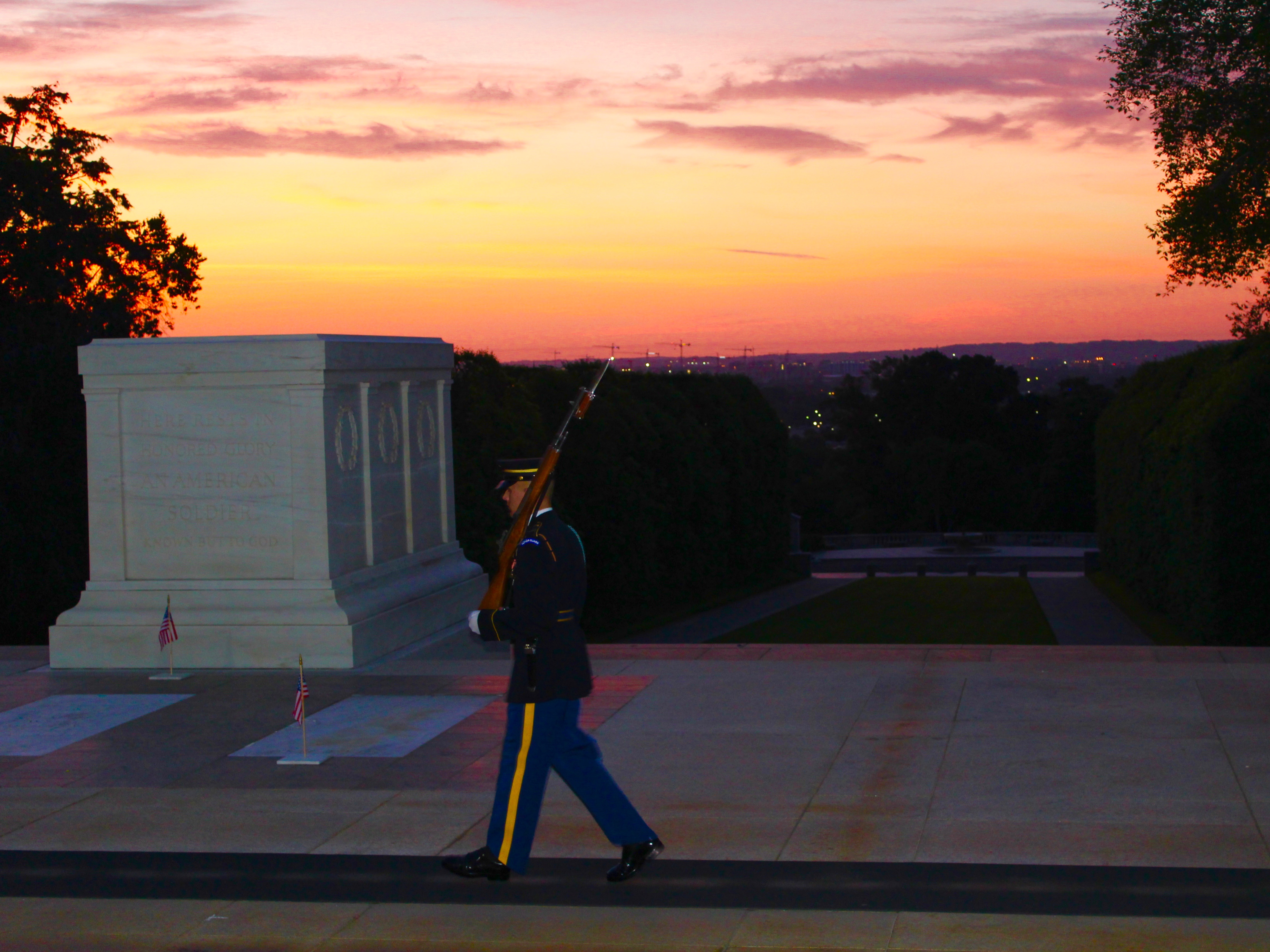 When we reached the tomb memorial, we could already see the sun’s deep hues rising in the east. We grabbed our gear and walked swiftly to the steps that were in front of the tomb, and I felt as if I had lost the ability to breathe. There, just feet in front of me, was the Tomb of the Unknowns and a single Guard standing sentry, silhouetted against the red wash of our Capital’s horizon.