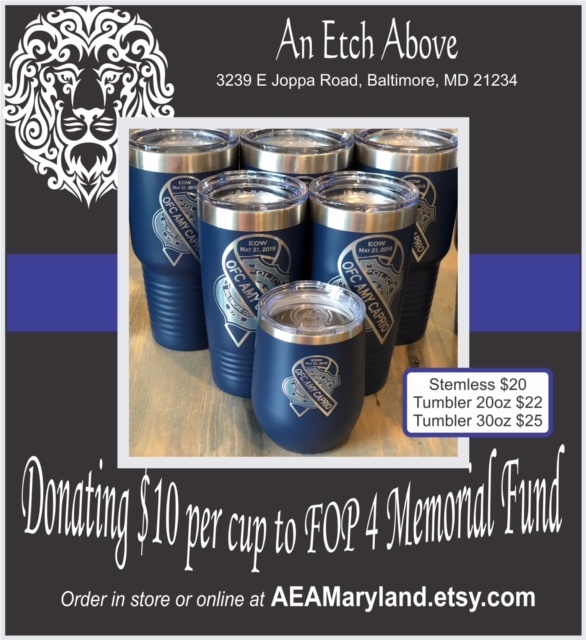 Kim Lyons, founder and owner of An Etch Above, created Memorial Cups in Officer Caprio’s honor. For each cup sold with the memorial design, Lyons is donating $10 to the FOP 4 Memorial Fund.