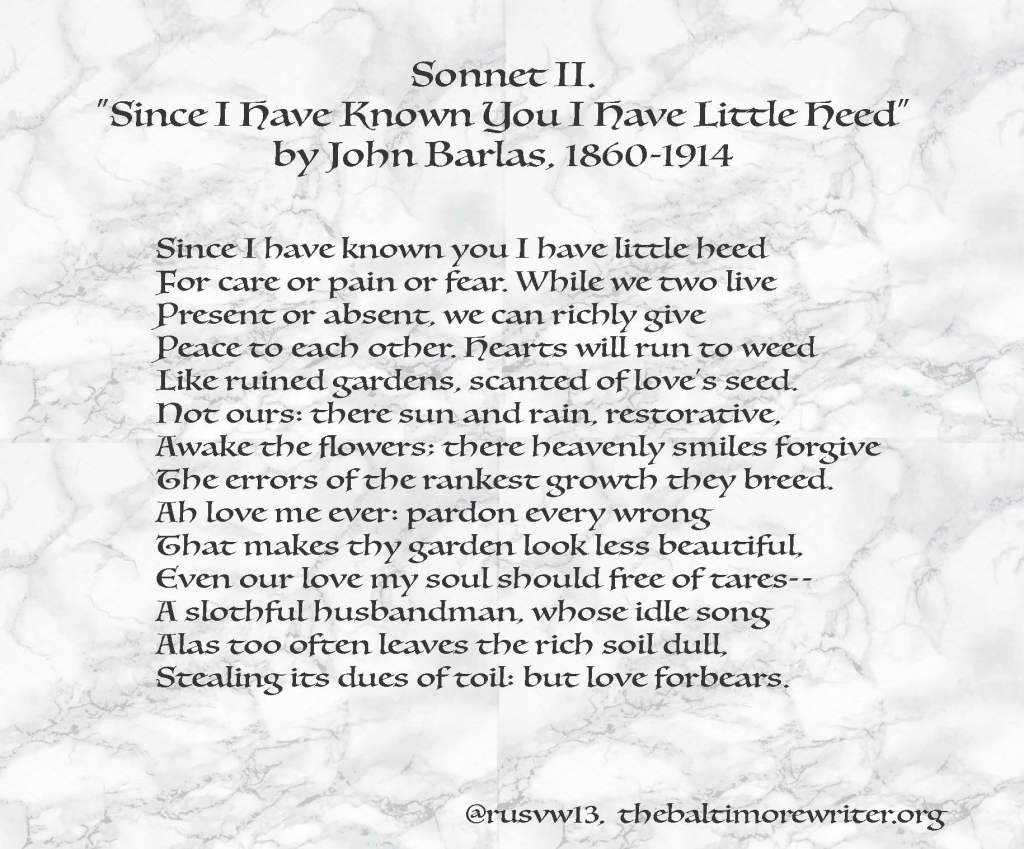 Welcome to day 3 of National Poetry Month. Today, I have chosen to read John Barlas’s Sonnet II, “Since I Have Known You I Have Little Heed,” written in the late 19th century. It is a Petrarchan Sonnet with a CDECDE sextet. I must give a shout out to my old friend Eric Blomquist who started a website titled Sonnet Central many years ago. It was there that I first read a Wordsworth sonnet for him, and I have visited the site often in the decades that have followed. Thank you, Eric, for your passion for sonnets; it burns still within me, and I am grateful to share that passion for sonnets with my students.