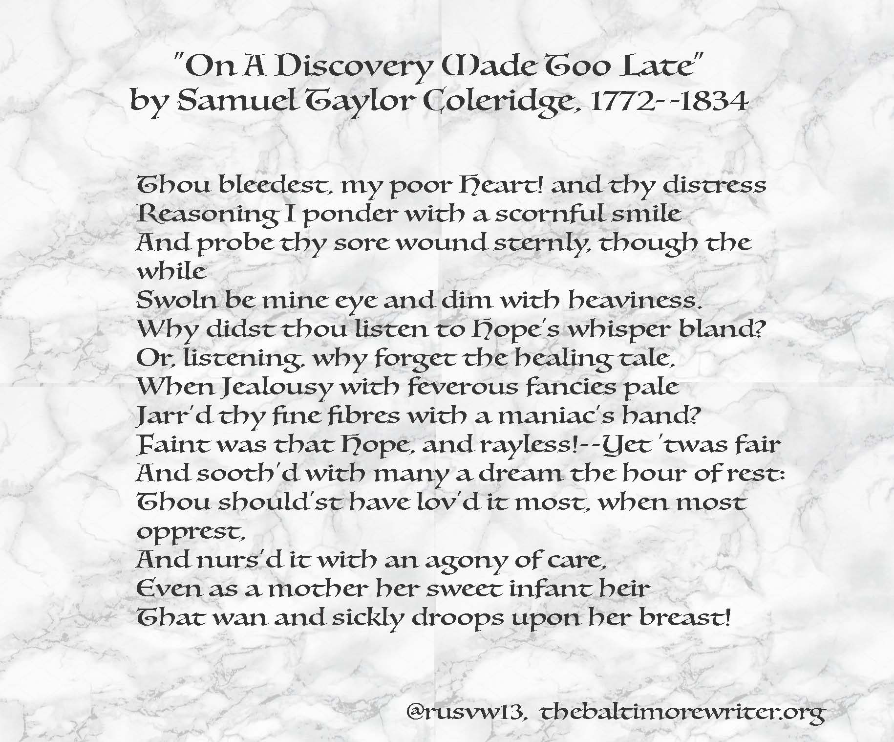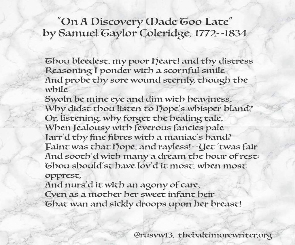 This sonnet, titled, “On A Discovery Made Too Late,” is vintage Coleridge, burning hot with passion, deep emotion, and regret.