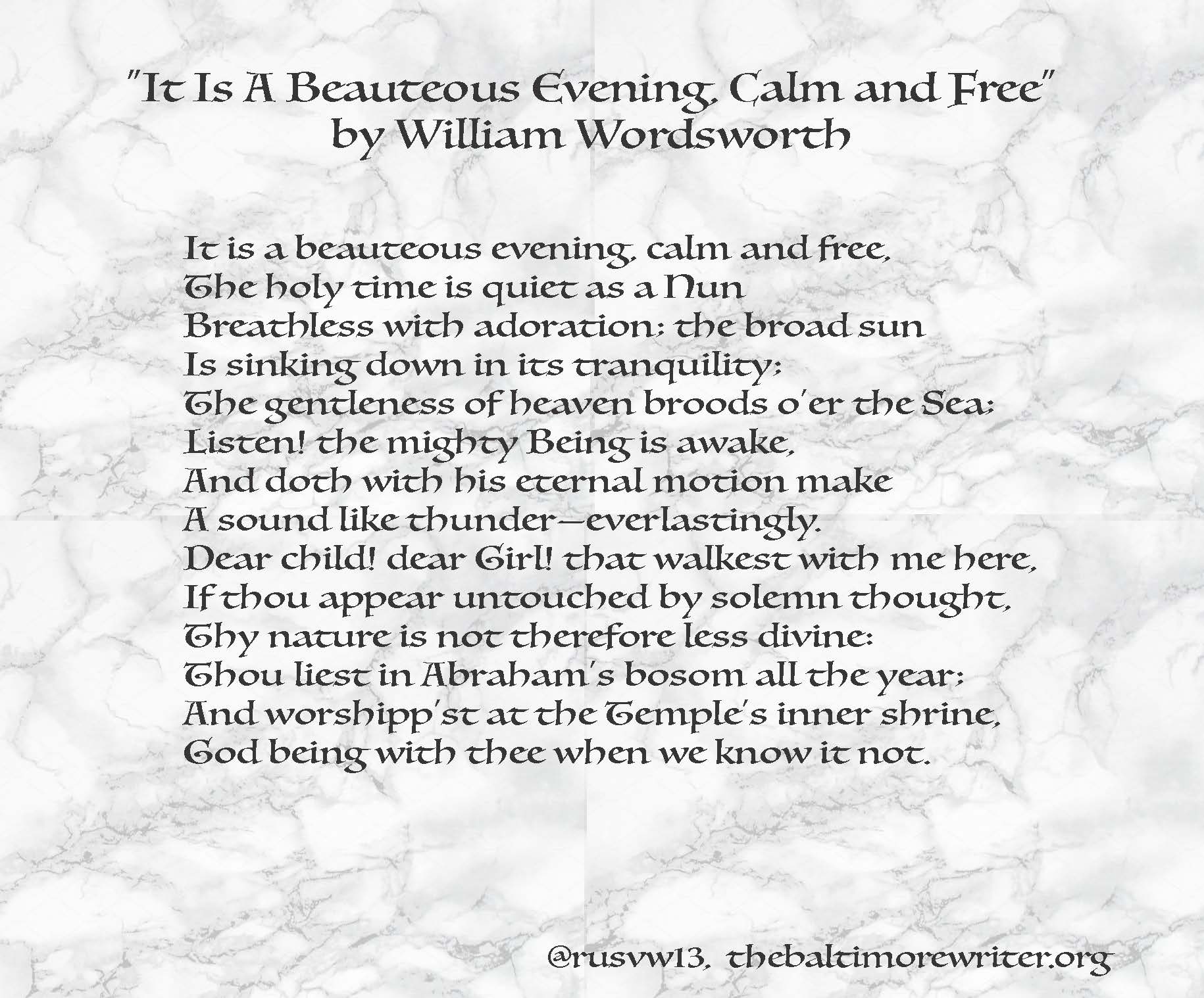 Today’s sonnet is from William Wordsworth (yay!). It was written in 1802, and as I explain before I read the sonnet, it celebrates, quietly, the ceaseless existence of beauty in nature, accessible to us even when we are not yet ready to receive it.