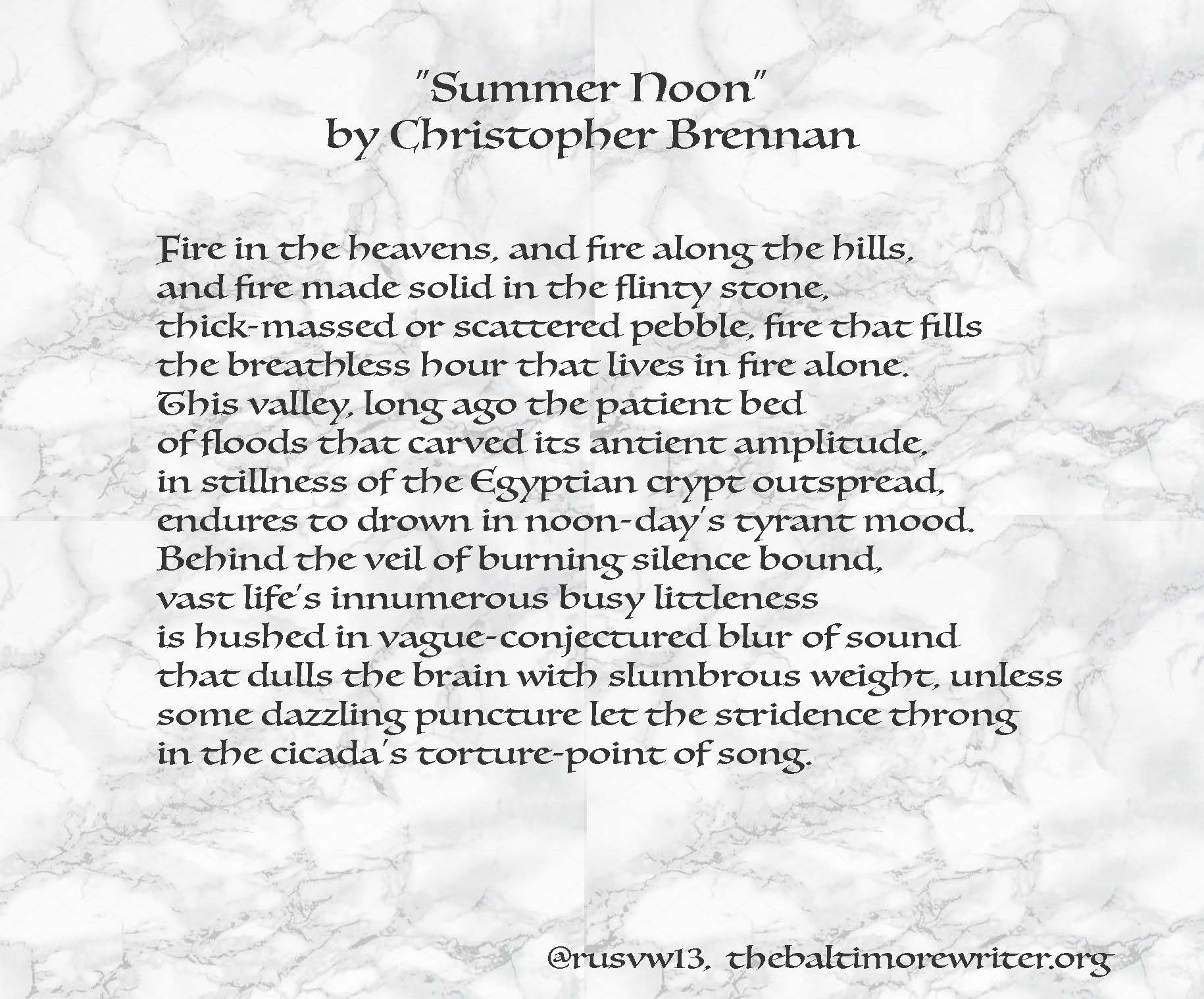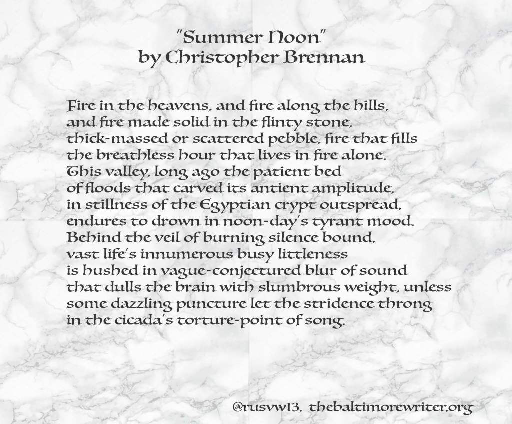 Today’s sonnet comes from Australian poet Christopher Brennan (1870-1932). It’s in English, or Shakespearean, form, and is filled with alliteration, assonance, and anaphora. 🙂