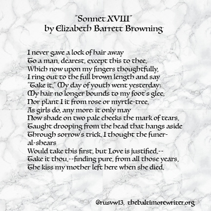 Today is April 9th of National Poetry Month, and I’ve decided to return to the sonnets of Elizabeth Barrett Browning; I’ve selected Sonnet XVIII for today’s reading.