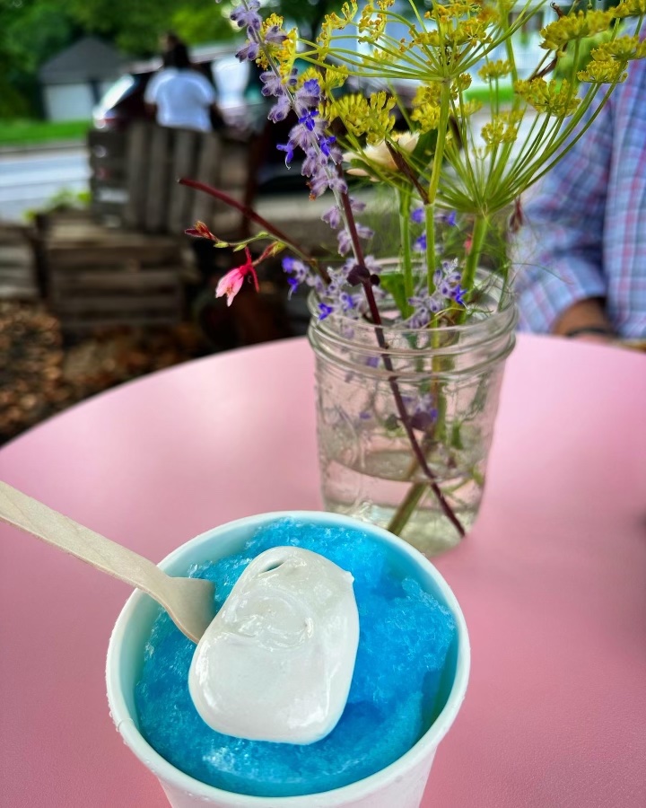 Anyway, Amy (who gets photo creds for the shot above) got a blue cotton candy (my BMore brain goes to skylight, but blue cotton candy just really works better here) with organic marshmallow (she said it was awesome, like subtly-sweet awesome), and I had the sugar-free chocolate. I concurred with Amy; mine, too, wasn’t sickly sweet like most sugar-free snowballs are, like they are trying to overcompensate for the absence of the already too sweet flavors loaded with high fructose corn syrup.
