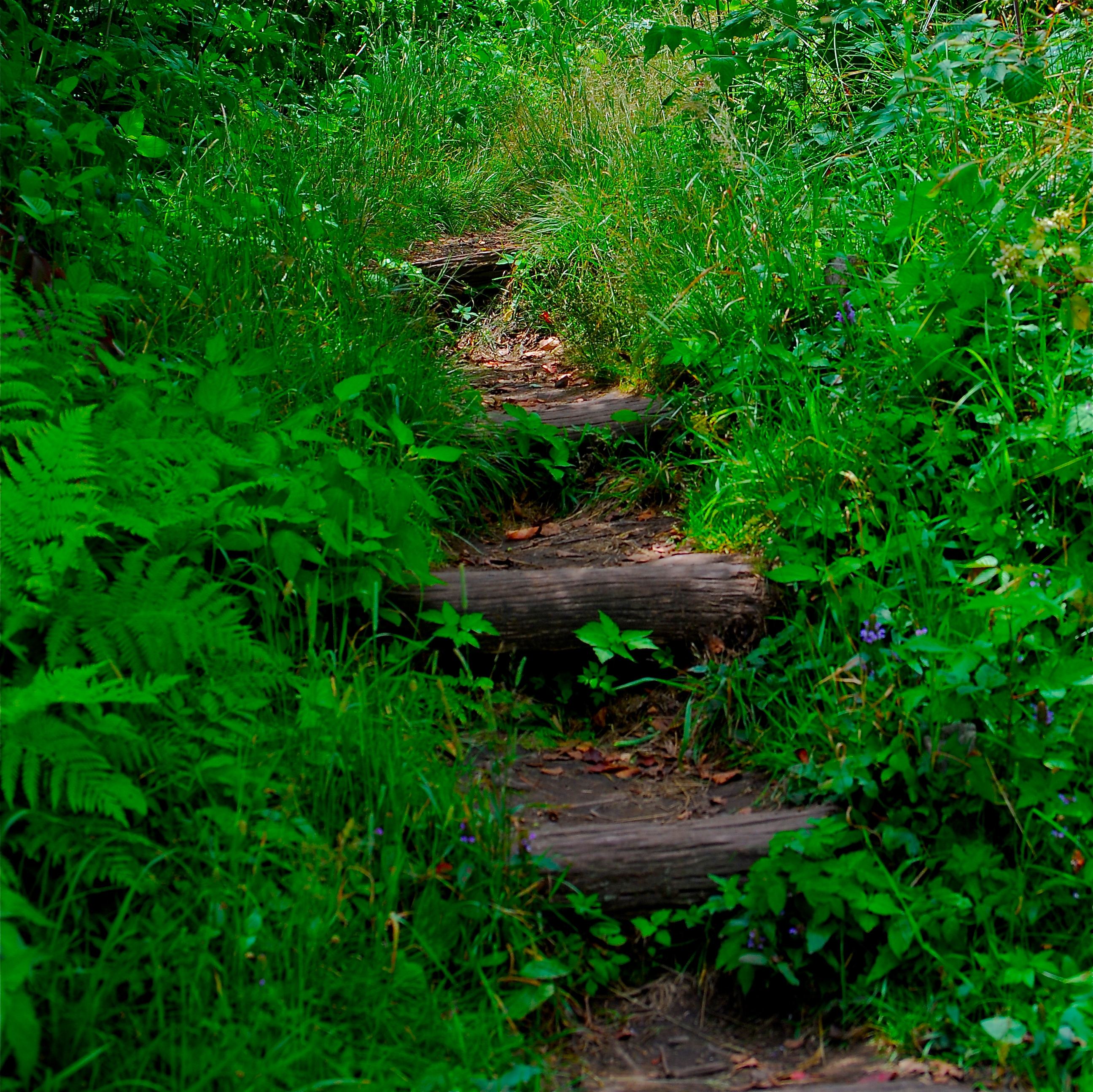 I turn to my left and look at the wooden steps that lead up and into the dark woods. A single white blaze, shrouded in the heavy brush of a mountain laurel bush, tells me this is the other way.