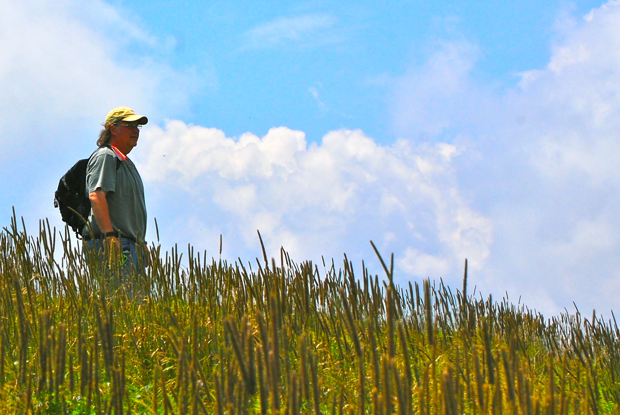 I want Cindy to go, too. Rob and I talk briefly about the possibility of taking her with us up the big hill, but we know what the terrain is like from our walk earlier in the week: an unforgiving steep pitch that is rocky in some places with knee-high grasses in others.