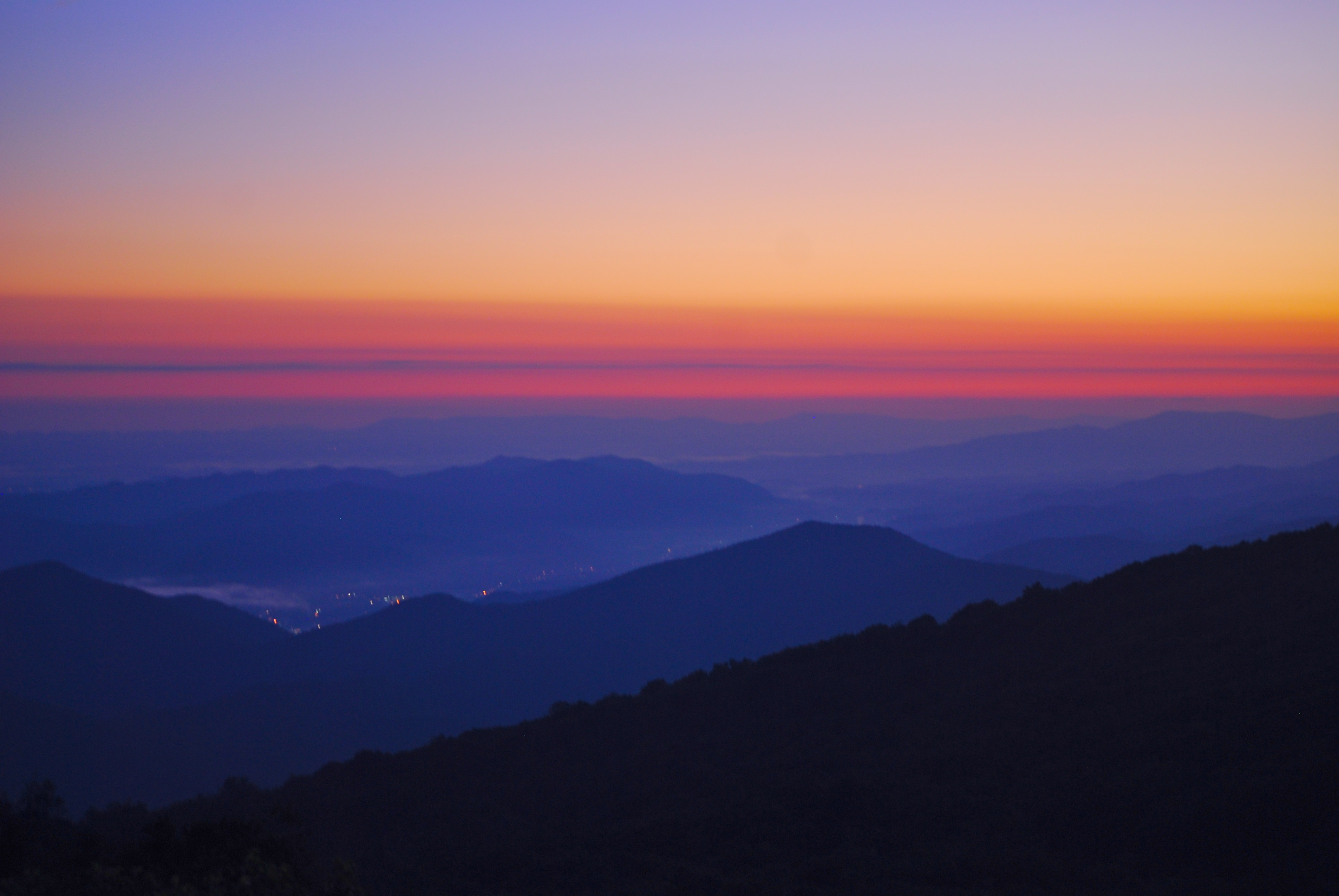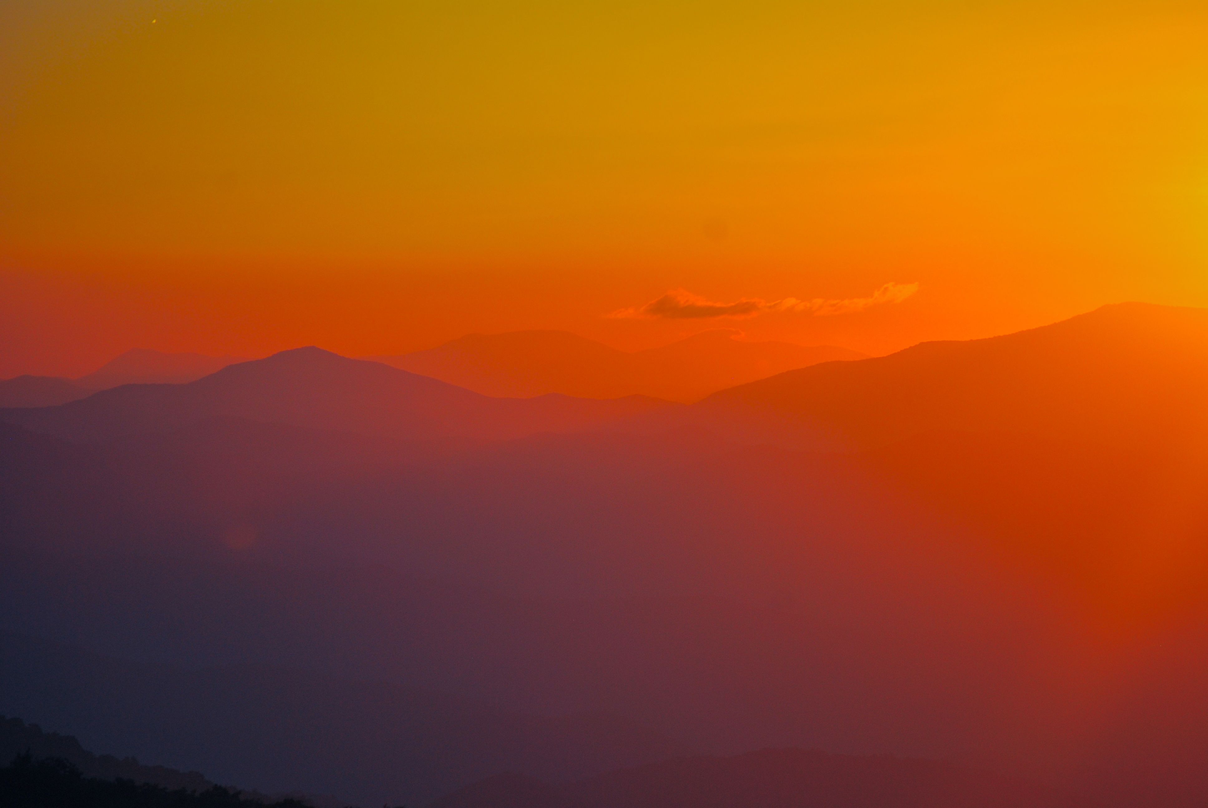 I turn around, and my breath is taken from me. A strong gust of cold wind blows by and I am bathed in deep reds, purples, and blues as the invisible, rising sun sends its precursory hues that define the deep ridges of the Great Smoky Mountains.