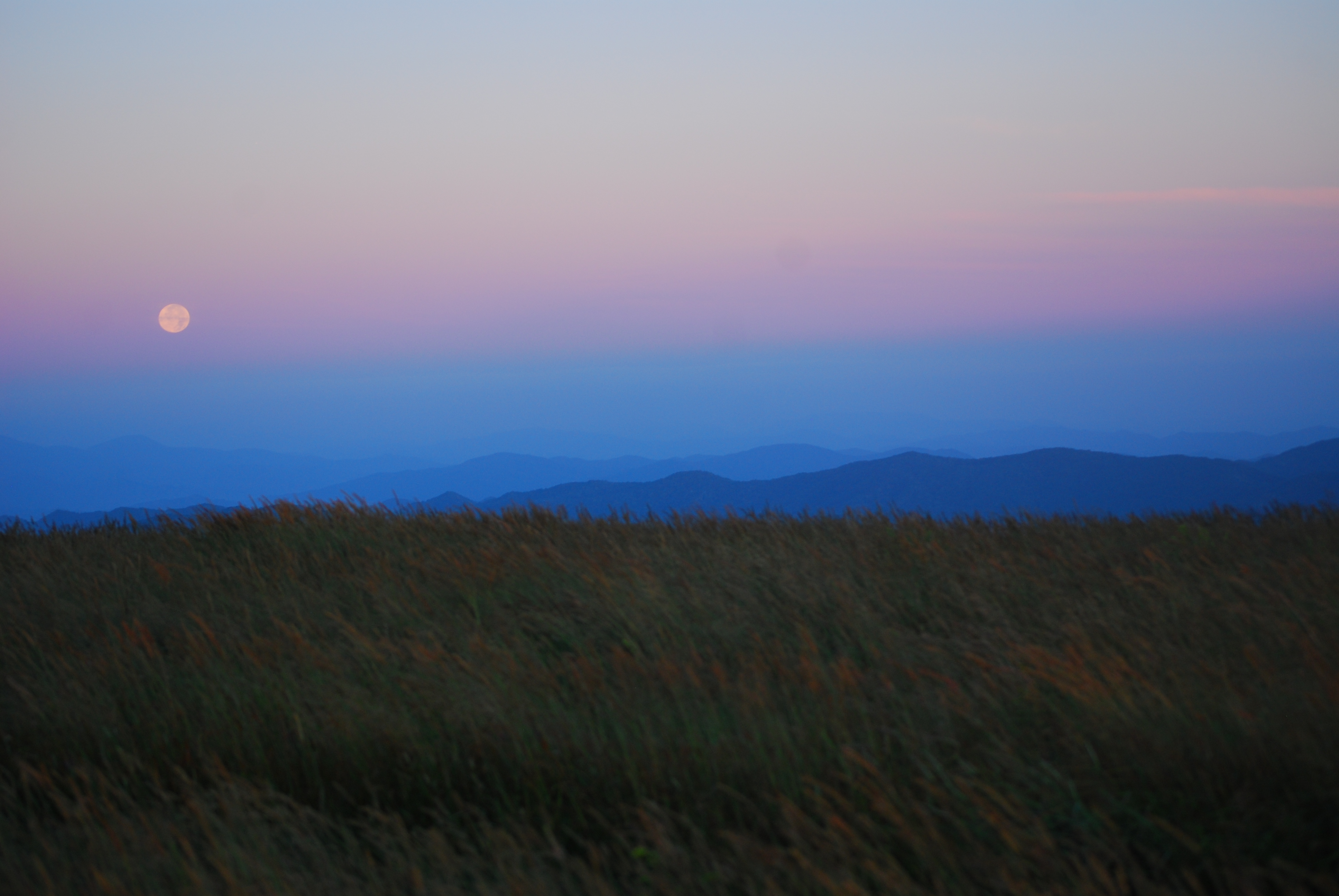 I stare at the very northeast tip of the mountain beyond Little Bald where the sun will first rise. I can feel the energy bursting already from that pinpoint, that precise place where night will become day. The heavy moon behind me bears the weight of a long night’s journey. It is tired and ready to surrender the early morning, if but for a short 14 hours and 2 minutes, to light.
